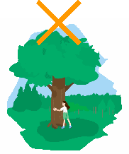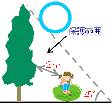 雷は高いところに落ちるという性質があります。開けたところではなく、木や建物、電信柱など高い物の近くに避難することが大切です。辺りに高い物がなく、自分が一番高い場合には、「直撃雷」の可能性が高くなります。安全な場所は、建物などのてっぺんから約45°の範囲です。これを「保護範囲」と言います。保護範囲の中であっても高い物に接近しすぎると、高い物に落ちた雷が人間に飛び移ってくることがあります。これを「側撃」と言います。「寄らば大樹の陰」は大変危険です。木の枝先から2m以上、建物から4m以上離れると安全だと言われています。しかし、背丈が4m以上ない場合には保護範囲がありませんので、姿勢を低くして、できるだけ速く安全な場所に移動することです。また、建物が30m以上ある場合には、保護範囲はそれ以上広がることはないようですので、建物から4m以上離れれば良しとし、あまり離れない方がよいでしょう。