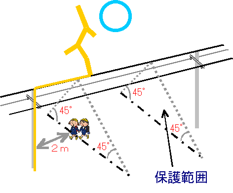 簡単に入りやすい建物があれば,その中に避難します。軒下は,その家の造りによっては,安全とは言えません。建物からの飛び火を避けるために,建物から4m以上離れましょう。すぐ近くに入りやすい建物がない場合は,電線の下がよいでしょう。電信柱や電線からも45°の保護範囲がありますので,その範囲内を移動しながら,もっと安全な建物の中に避難します。電信柱に手を触れず,一応2m以上は離れておきましょう。