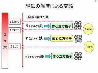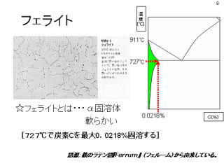 フェライト・オーステナイト・パーライト・セメンタイトについてそれぞれ説明を行い,スライドP.13の説明につながるようにする。 |