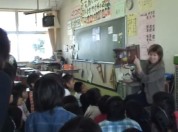 | 【授業のポイント】 この授業のねらいは、英語の指示に反応したり、作業をしたりできるようになることと、外国の行事に触れ、親しみをもたせながらコミュニケーション活動を行わせることである。10月のALTの来校日に合わせて活動を行う。まず、あいさつをした後、「秋」や「10月」から連想することを出させ、日本にはない外国の季節行事として、「ハロウィン」があることと、ハロウィンの意味を簡単に知らせる。写真やおもちゃのお化けなどを提示して児童の興味を喚起した後、ハロウィンを題材とした絵本「In a Dark Dark Wood」を読み聞かせる。次に、ハロウィンビンゴをするための準備を英語の説明や指示で行う。出来上がったら切り離してビンゴゲームを楽しませる。最後にALTやHRTに「Trick or Treat」と言う活動をさせる。言えたらスタンプを押したり、シールやキャンディーなどを渡したりして楽しい活動としたい。 |
