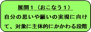 | 自分の思いや願いの実現のため、対象にかかわり具体的な活動や体験を行う展開(おこなう)段階では、繰り返し対象にかかわり、その都度、気付いたり考えたり、感じたりしたことを表現し伝え合う活動を位置付けることができます。そして、表現し伝え合う活動を通して、再び気付いたことを明確に残すことで、さらなる活動への意欲、対象へのかかわり方などを考えたりすることにつながるのではないかと考えます。この段階では特に、対象に繰り返しかかわりがあり、そこ中でで気付きを比較したり関連付けたり例えたりすることができると考えます。 | |||||||||||||||||||||||||||||||||