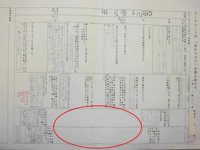 ◇登場人物ごとの言動に着目しながら、物語を時系列にまとめる活動を1枚のワークシートを使って行うことによって、生徒は物語には書かれていない空白部分があることに容易に気付くことができていました。その空白部分を想像しながら埋めていく過程で、その根拠となる登場人物の心情や情景等の描写を考えながら読む活動は、物語の筋立てをとらえさせるのに有効であるとともに、描写に注意して読むことを意識付けることができました。