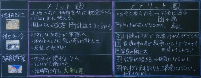 | 明治政府が行った地租改正、徴兵令、殖産興業の3つの政策について、政策のメリット(よい点)とデメリット(問題点)を整理した。その際、根拠となるデータ(資料や教科書の記述など)はなくても、予想による理由付けがあれば取り上げていった。これらを基に、明治政府の政策について、成功か失敗かで評価させ、自分の考えと友達の考えとで意見交流を行わせた。これにより、「国家」と「国民」という立場の違いに気付かせ、意見交流を踏まえた考えを記述させる(意思決定1)ことで、討論型の学習へと促した。 | ||||||||||||||||||||||||||||||||||||||||||